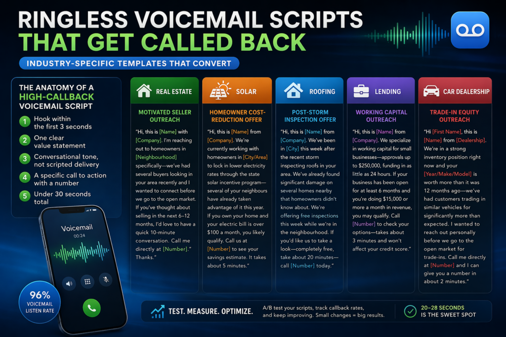 This guide breaks down what makes a ringless voicemail script work, then provides tested, industry-specific templates for the sectors where Drop sees the highest campaign volume: real estate, solar, roofing, lending, and car dealerships.